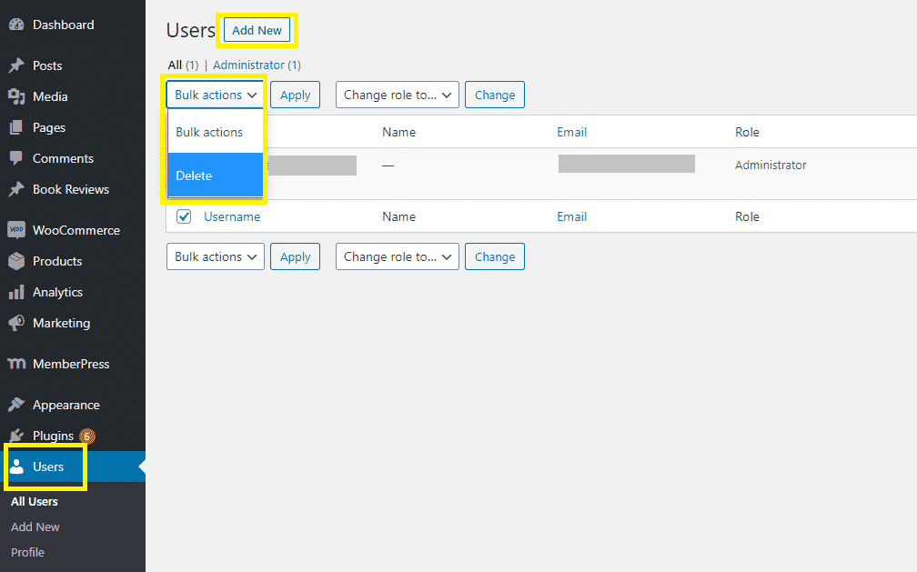 Then, select the original ‘admin’ account from the users list, choose Delete from the dropdown menu, and click on Apply. If there was any content previously published under the ‘admin’ username, you may need to reassign those posts to a new author.